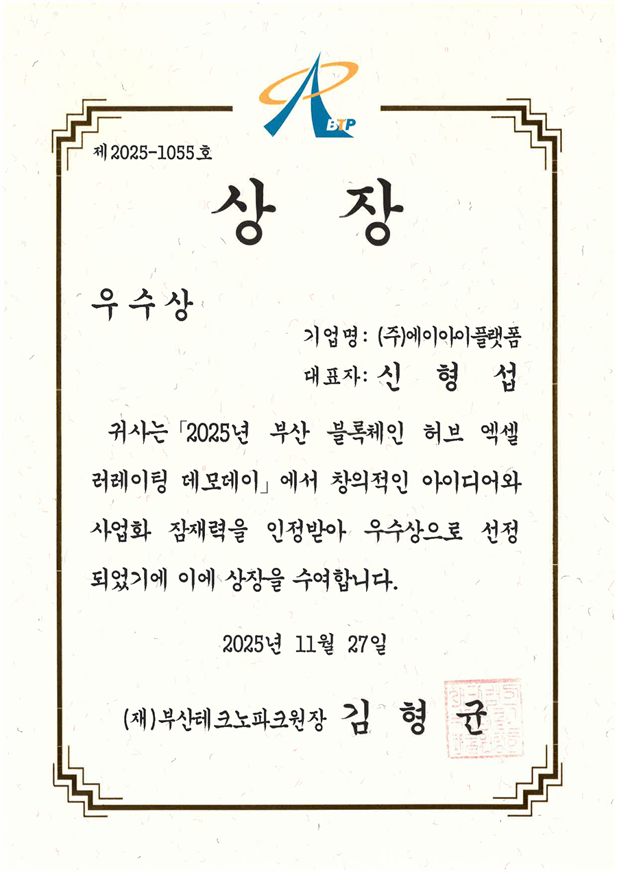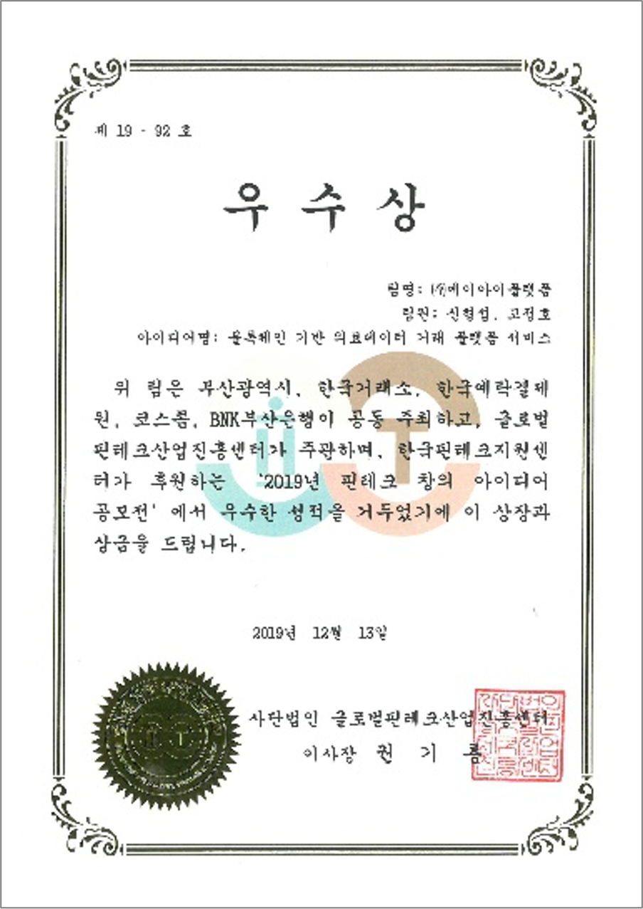 부산 블록체인 허브 엑셀러레이팅 데모데이 우수상 |