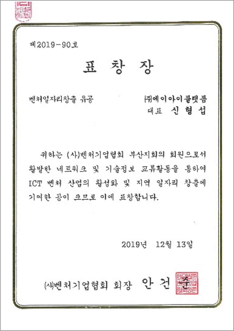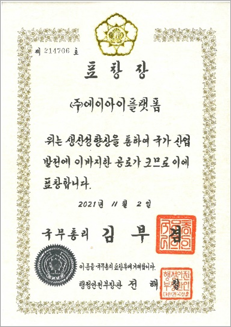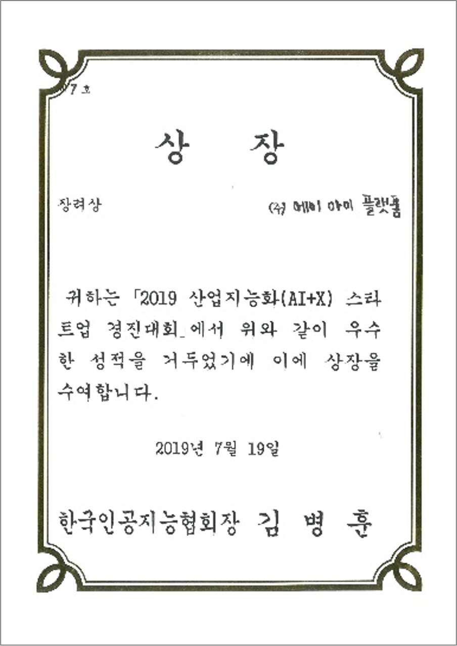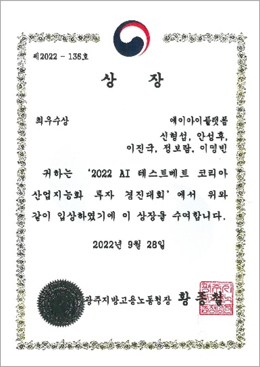 AI 테스트베드 코리아 산업지능화 투자 경진대회 최우수상 |